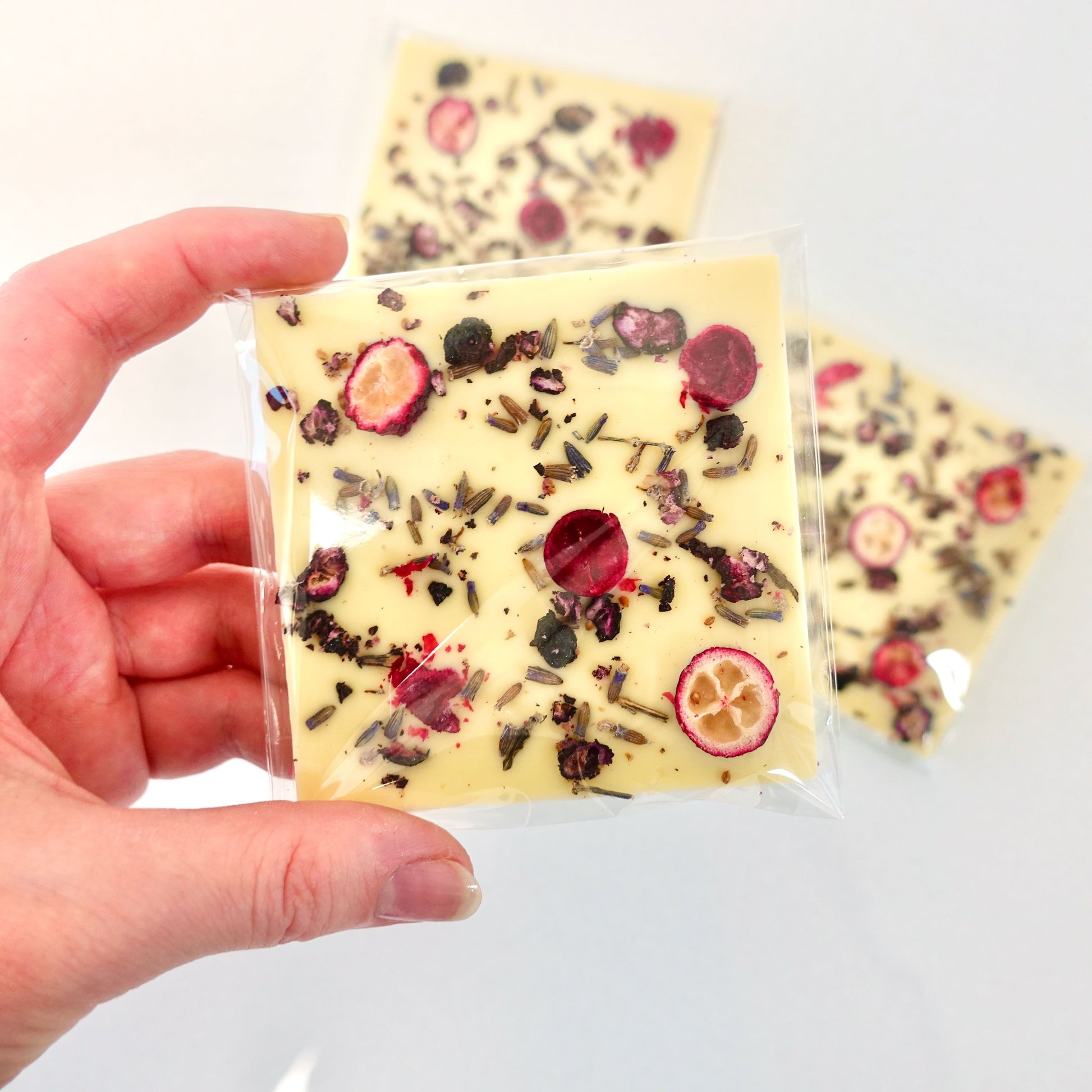ABOUT THIS PRODUCT: A creamy 24% Belgian white chocolate bar topped with Freeze Dried Blueberries, Freeze Dried Cranberries and Lavender Buds