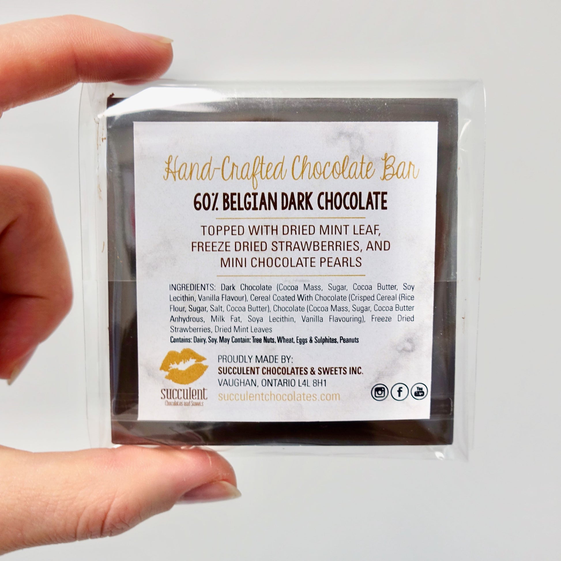 ABOUT THIS PRODUCT: A decedent 60% Belgian dark chocolate bar topped with Freeze Dried Strawberries, Dried Mint Leaves and Mini Chocolate Pearls