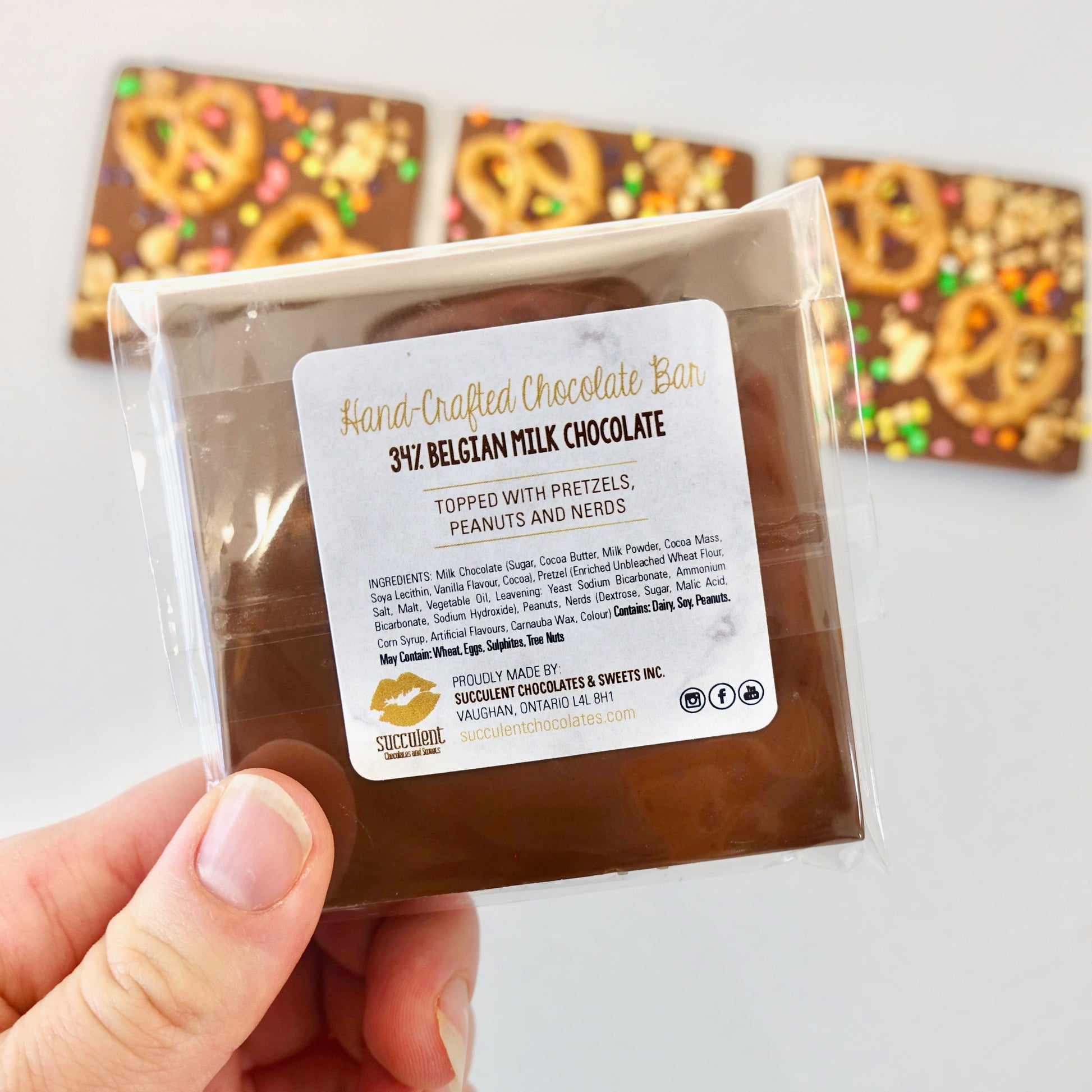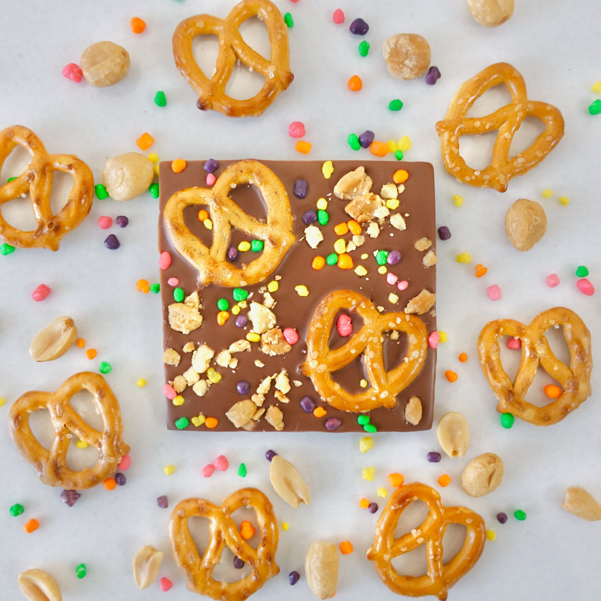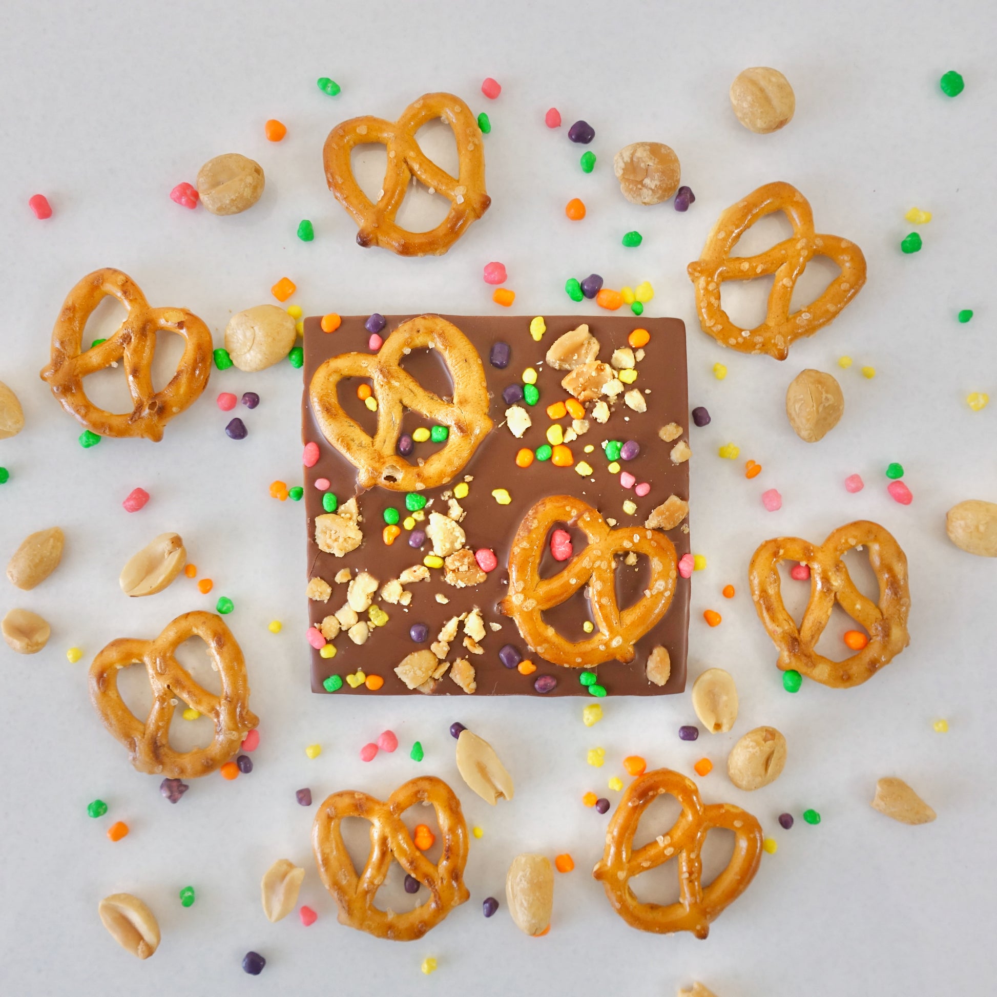 ABOUT THIS PRODUCT: A smooth 34% Belgian milk chocolate bar topped with salty Pretzels, creamy peanuts and crunchy Nerds.