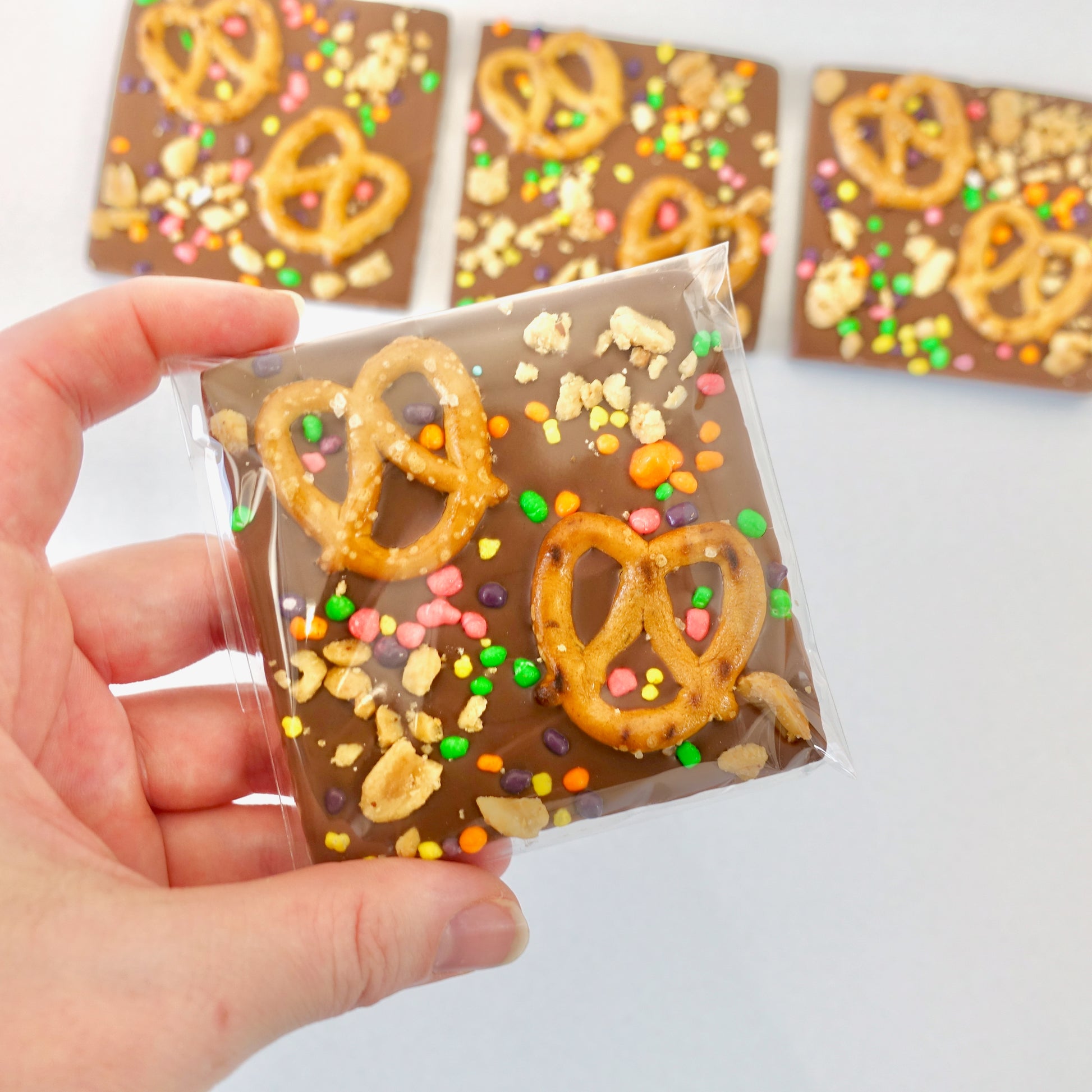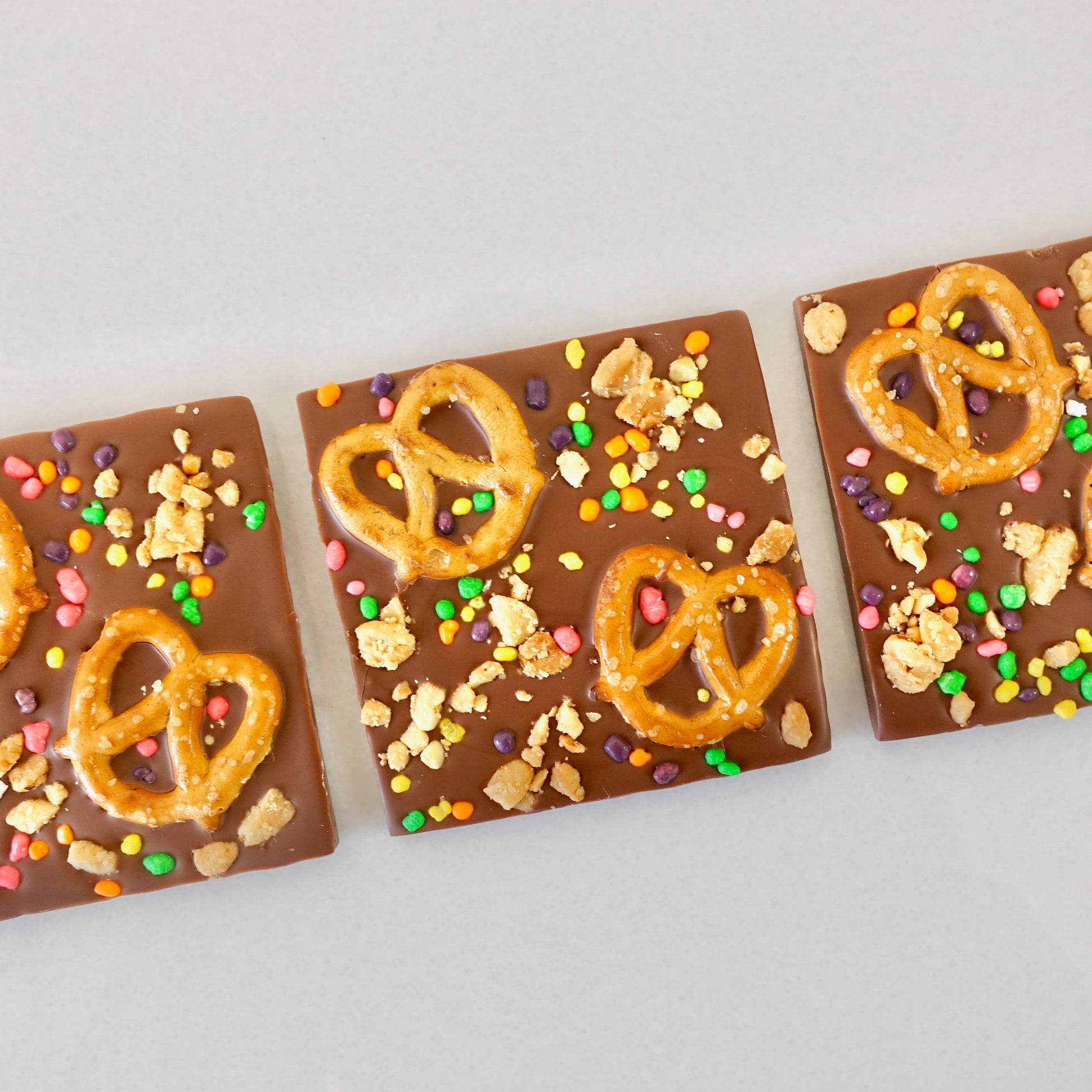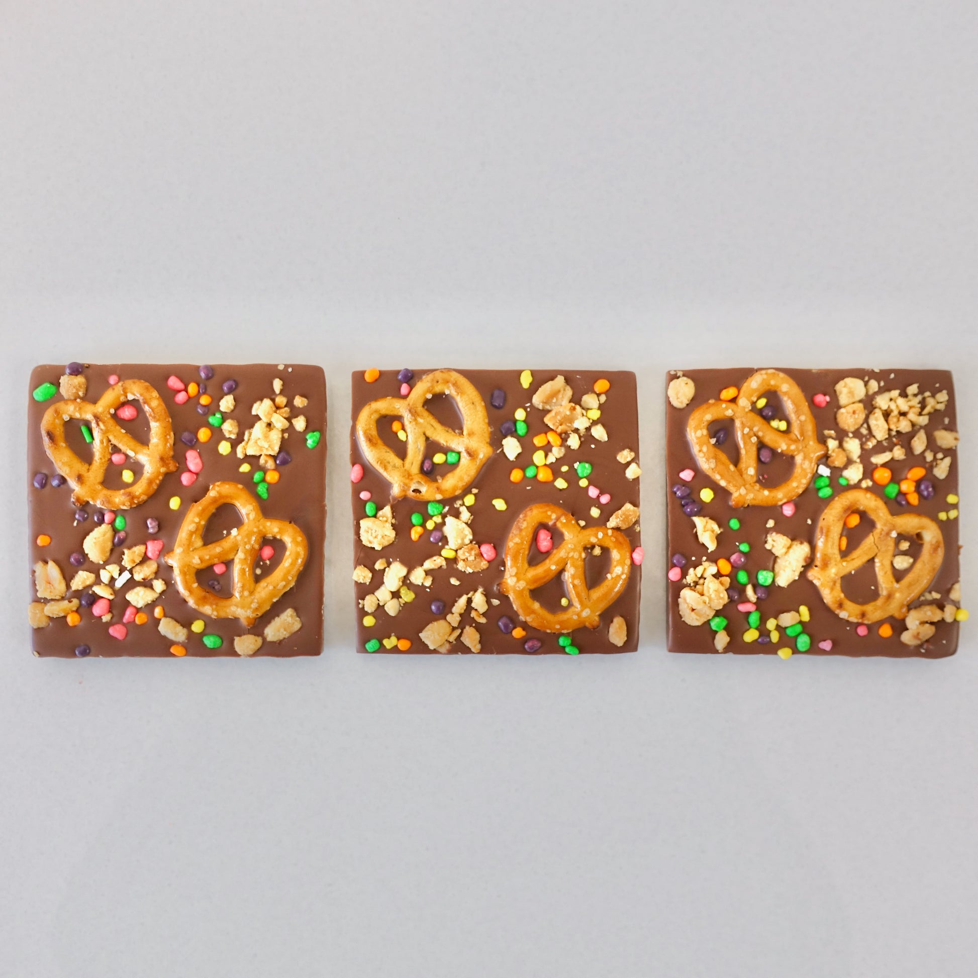 ABOUT THIS PRODUCT: A smooth 34% Belgian milk chocolate bar topped with salty Pretzels, creamy peanuts and crunchy Nerds.
