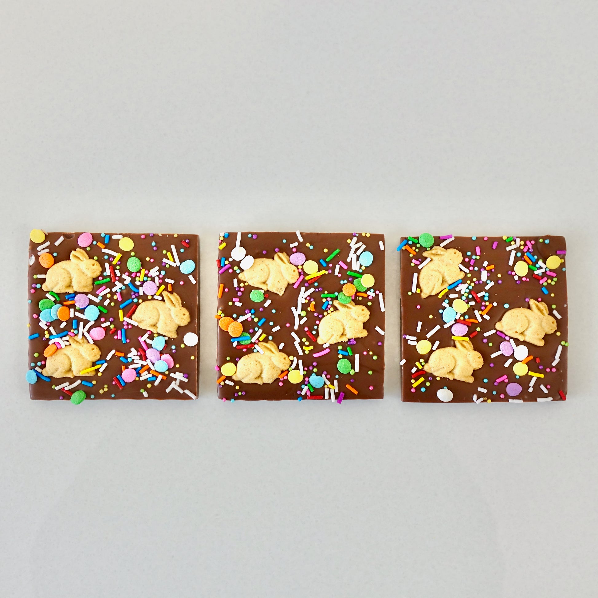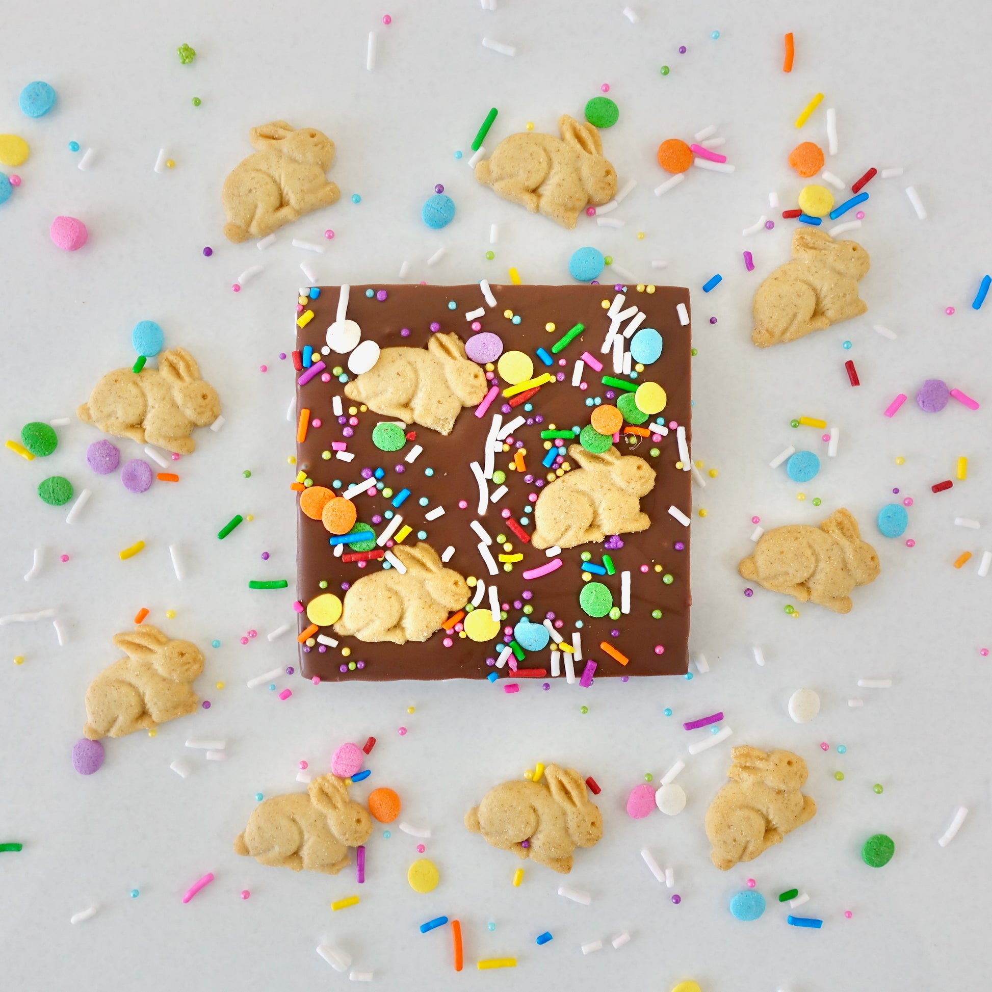 ABOUT THIS PRODUCT: A rich 34% Belgian milk chocolate bar topped with bunny graham crackers and assorted sprinkles.