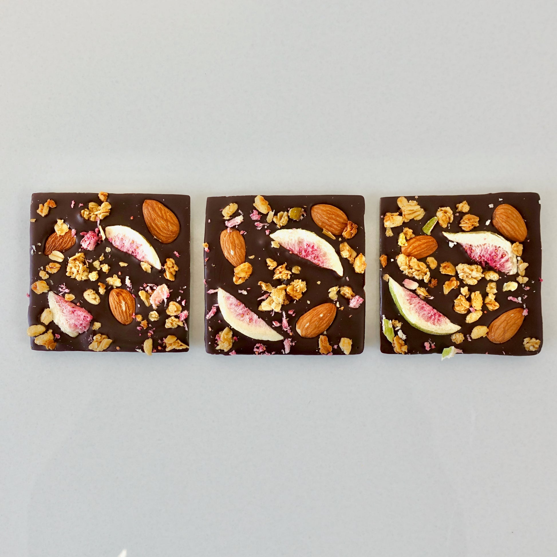 ABOUT THIS PRODUCT: A delicious 60% Belgian dark chocolate bar topped with Freeze Dried Figs, crunchy almonds and granola mix.