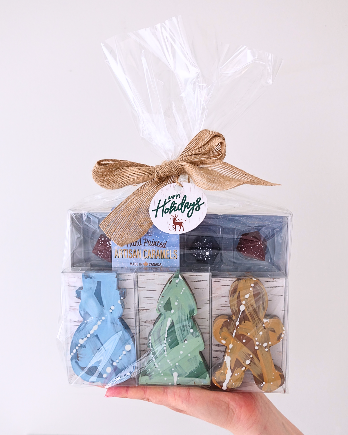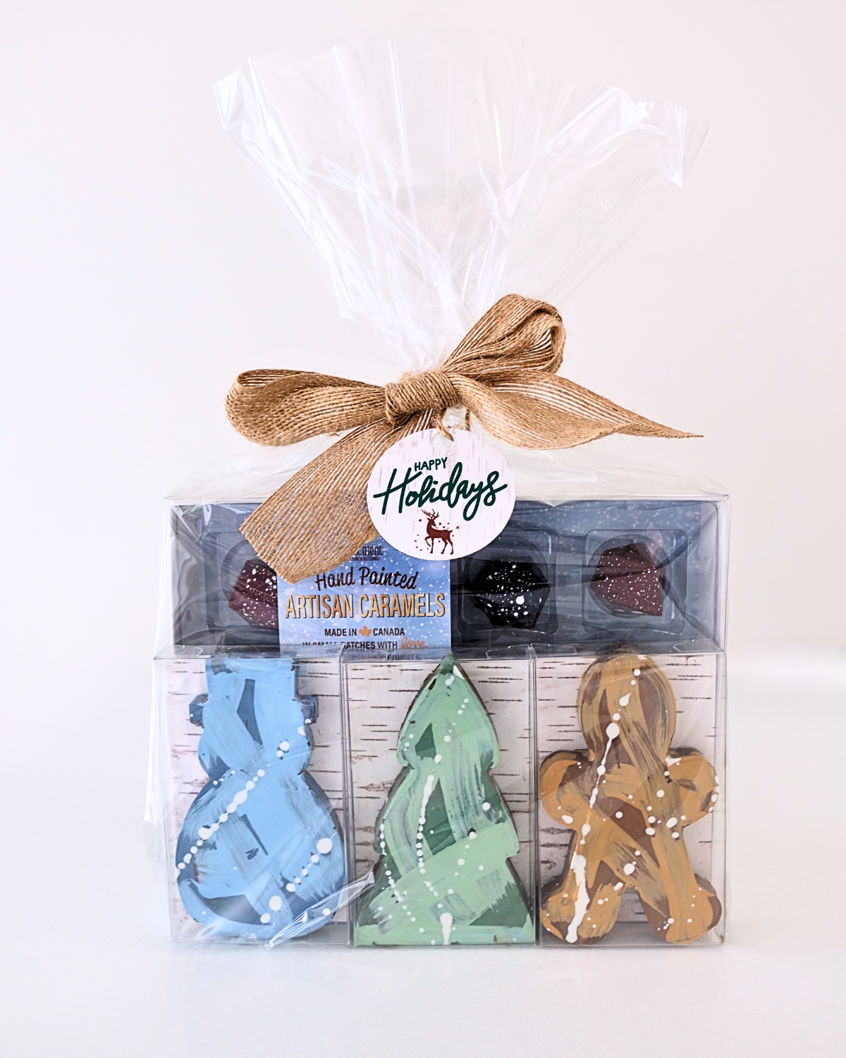 ABOUT THIS PRODUCT: Celebrate the season with this beautifully curated gift set featuring two festive favourites: three of our signature Truffle Bar Ornaments, and a Box of 12 handcrafted Winter Caramels in rich, seasonal flavours.